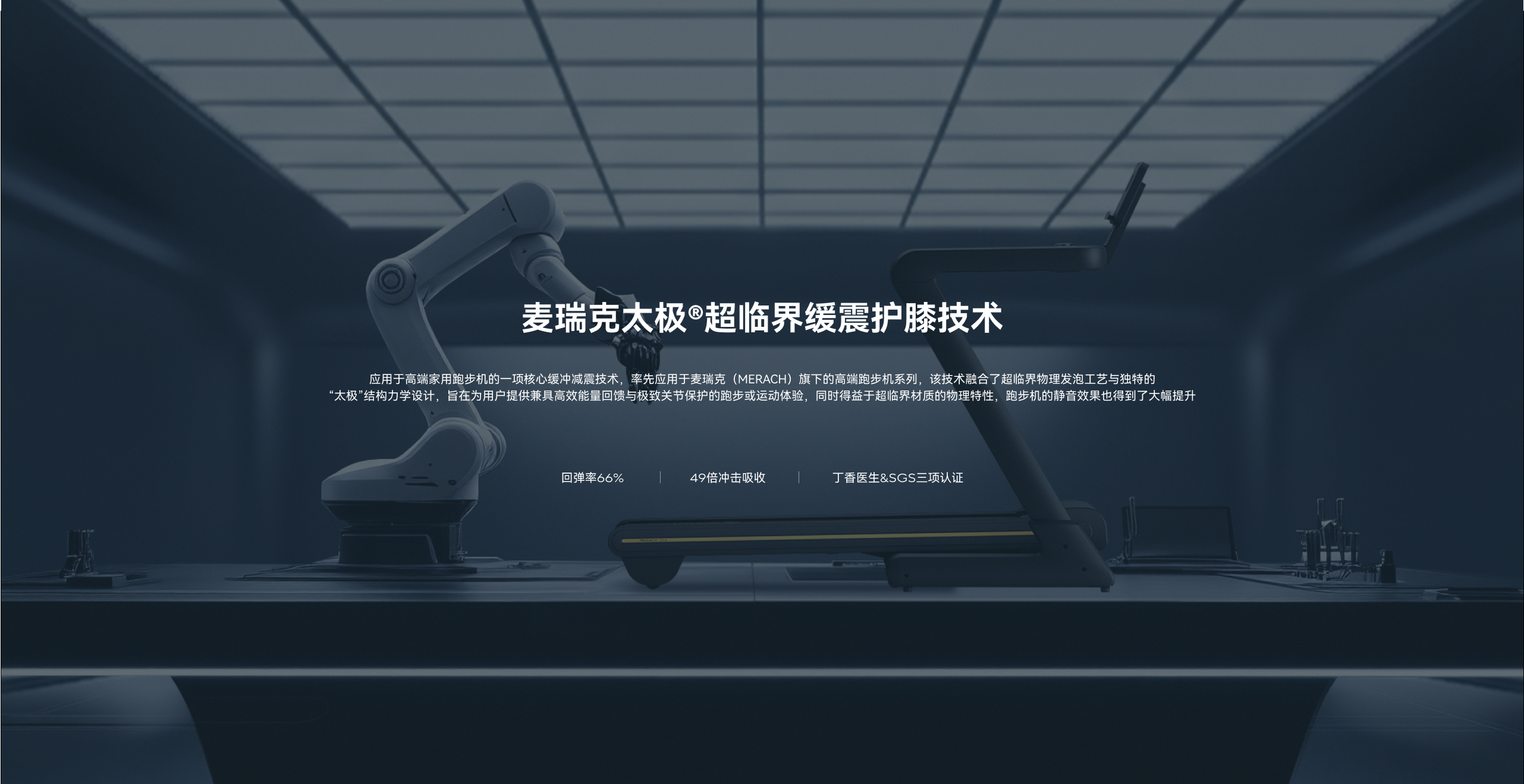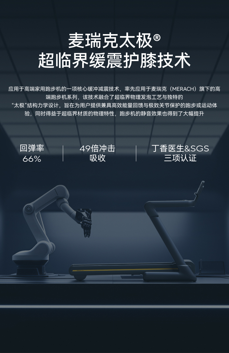 家用跑步机的一项核心缓冲减震技术,率先应用于麦瑞克(MERACH)旗下的高端跑步机系列,该技术融合了超临界物理发泡工艺与独特的“太极”结构力学设计,