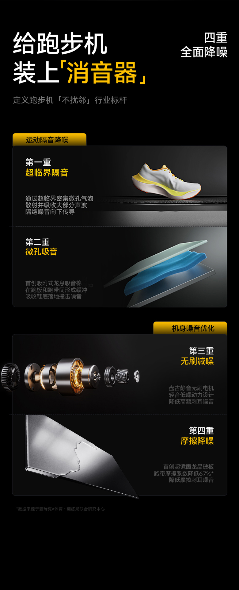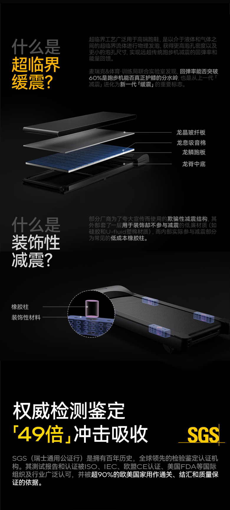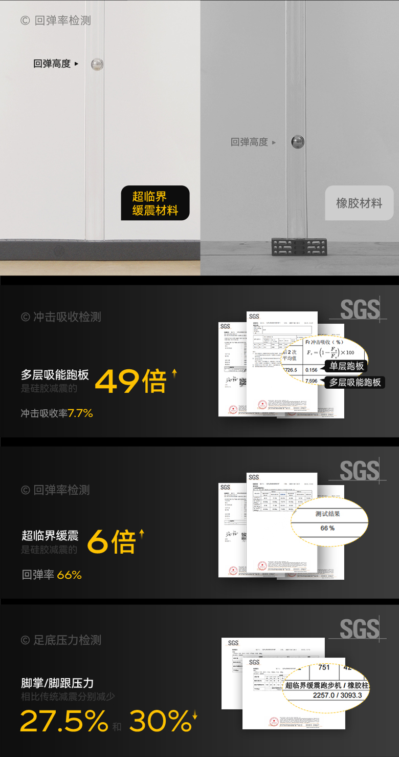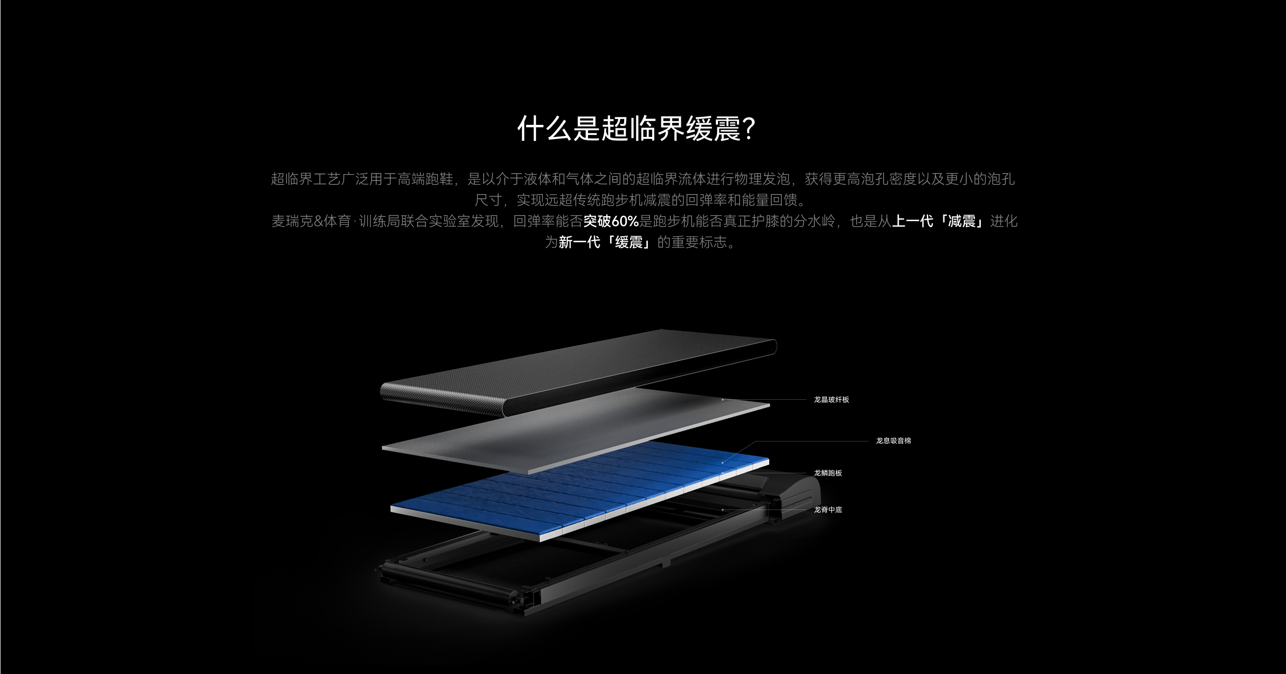 旨在为用户提供兼具高效能量回馈与极致关节保护的跑步或运动体验,同时得益于超临界材质的物理特性,跑步机的静音效果也得到了大幅提升