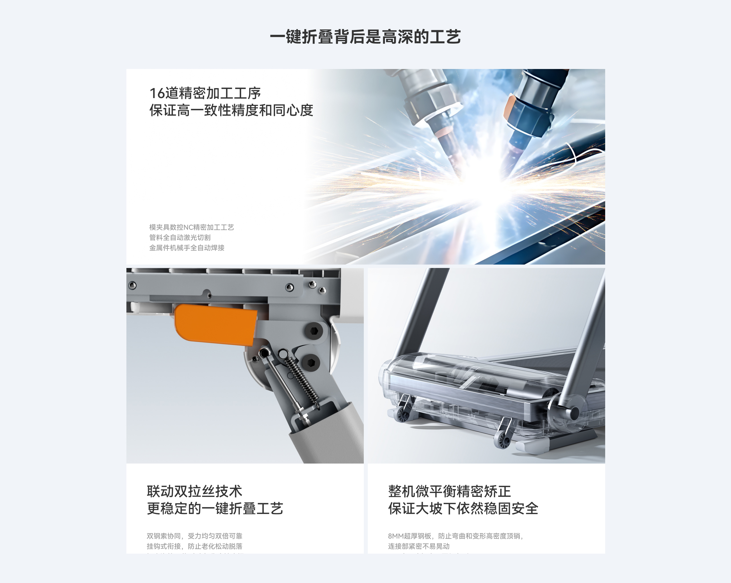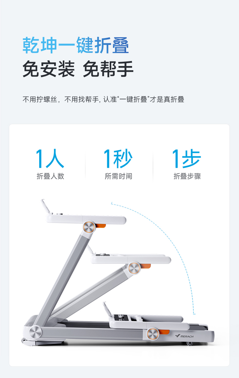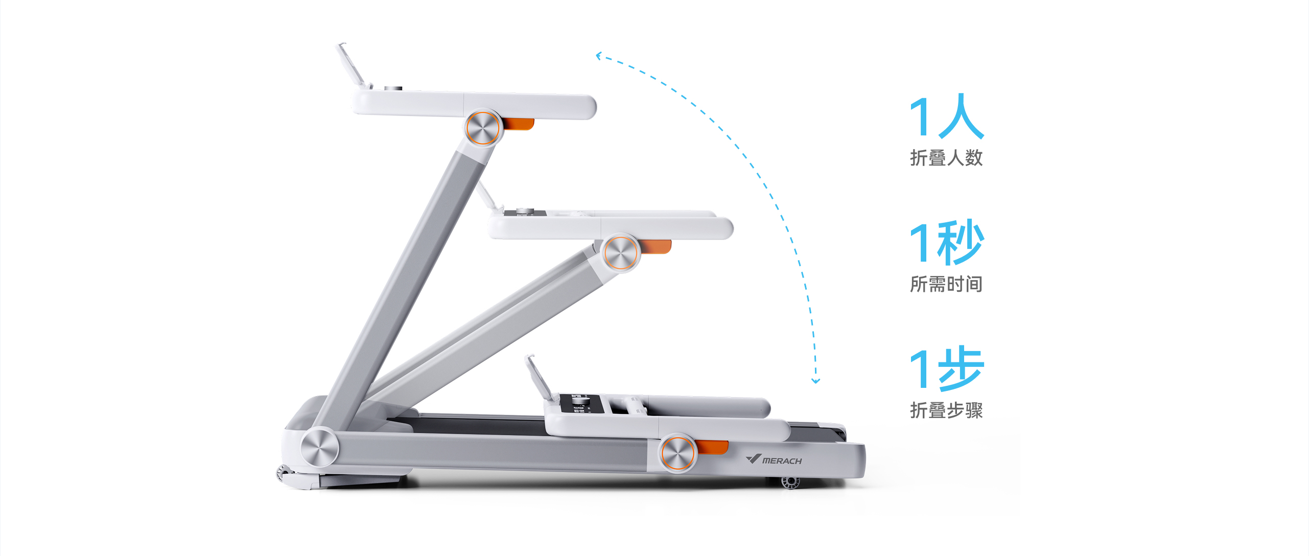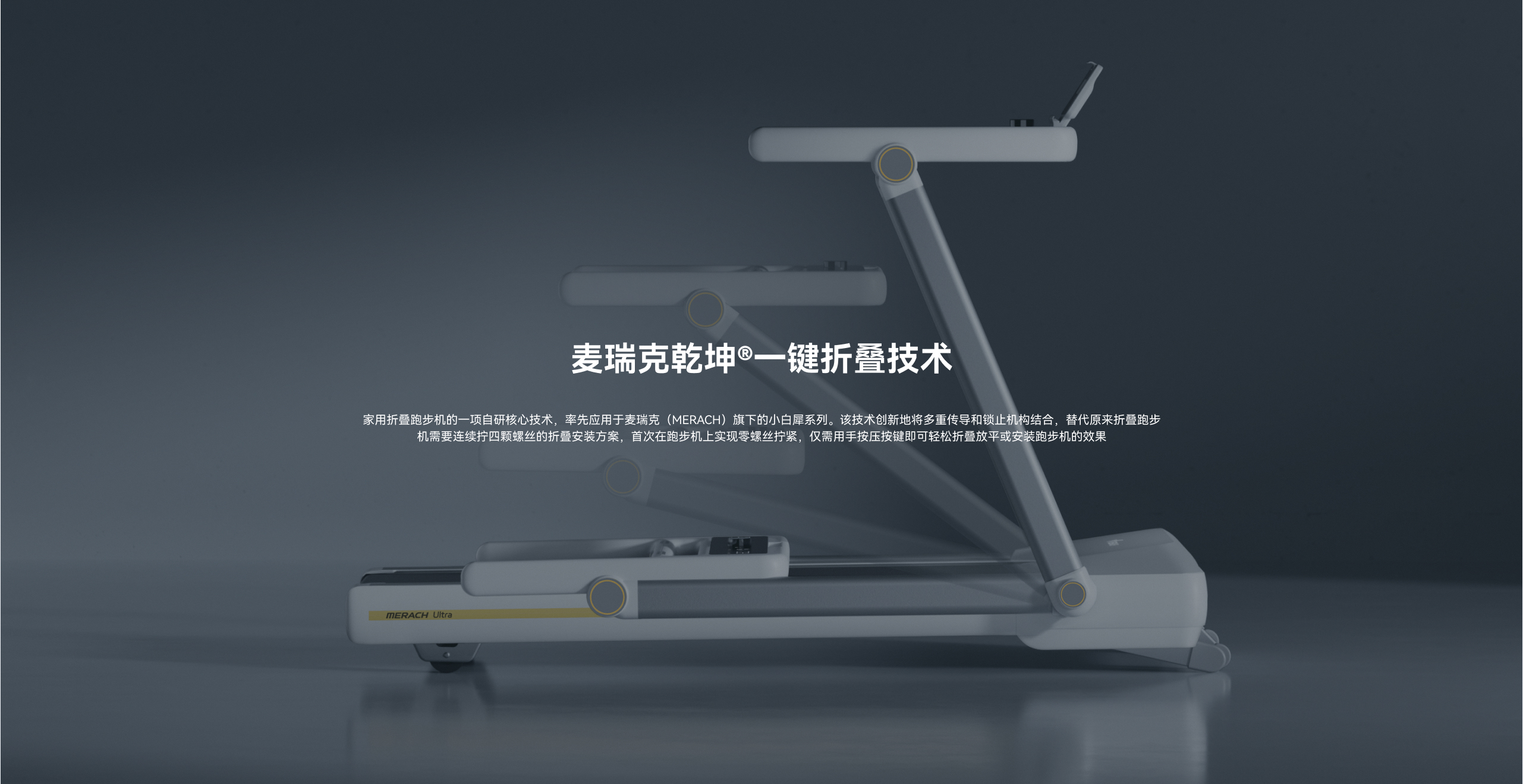 家用折叠跑步机的一项自研核心技术,率先应用于麦瑞克(MERACH)旗下的小白犀系列。该技术创新地将多重传导和锁止机构结合,替代原来折叠跑步机