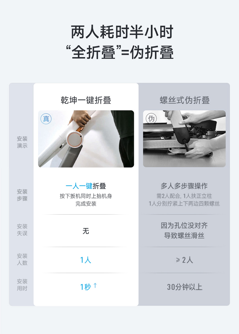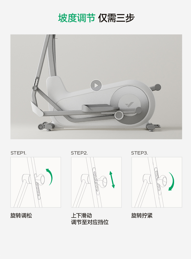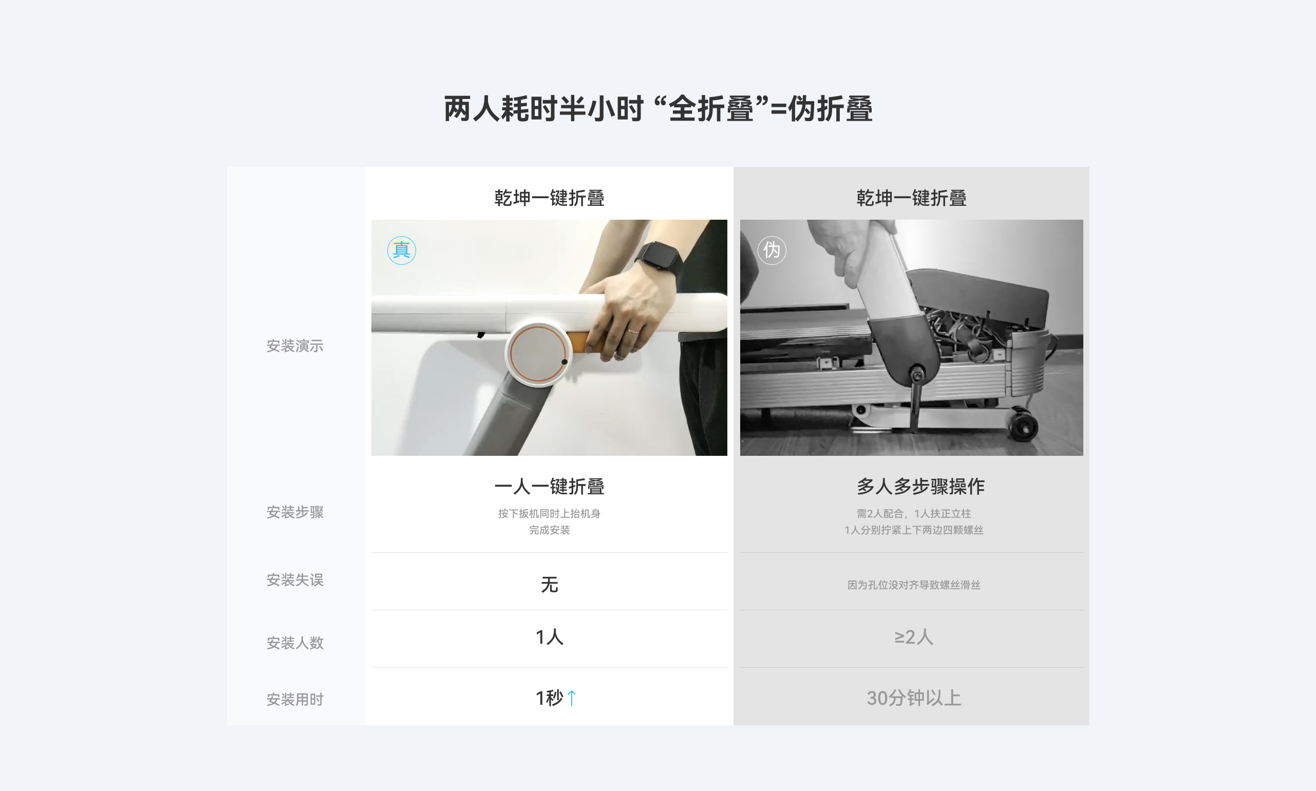 需要连续拧四颗螺丝的折叠安装方案,首次在跑步机上实现零螺丝拧紧,仅需用手按压按键即可轻松折叠放平或安装跑步机的效果