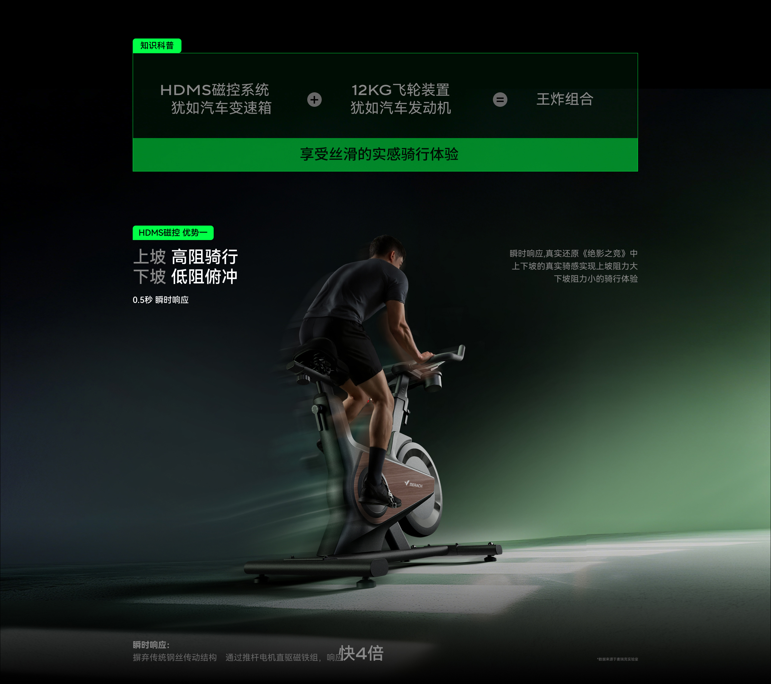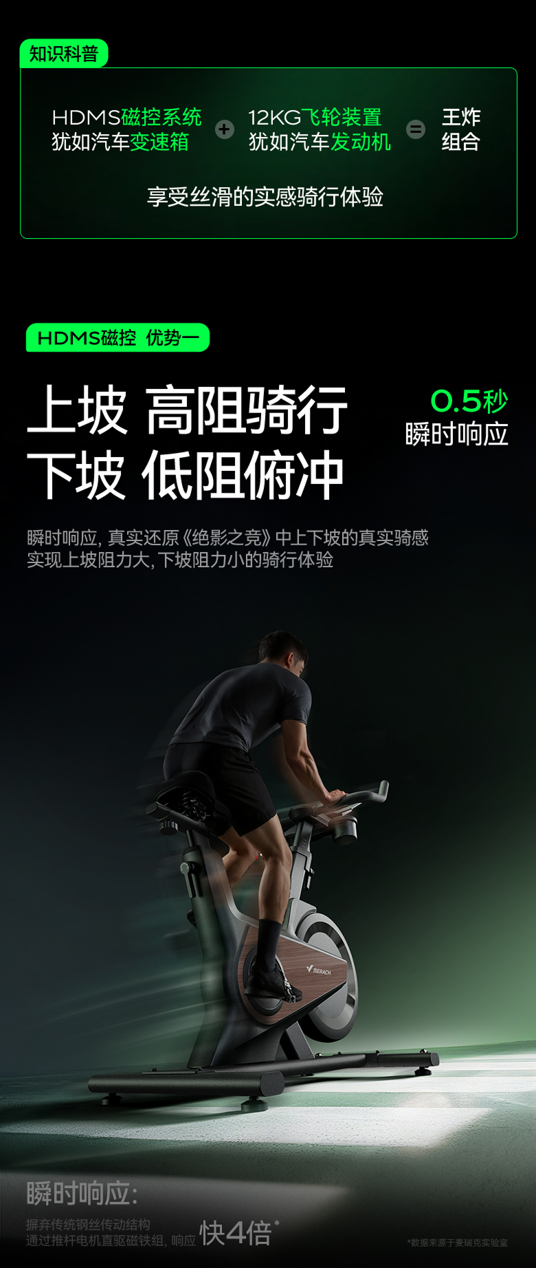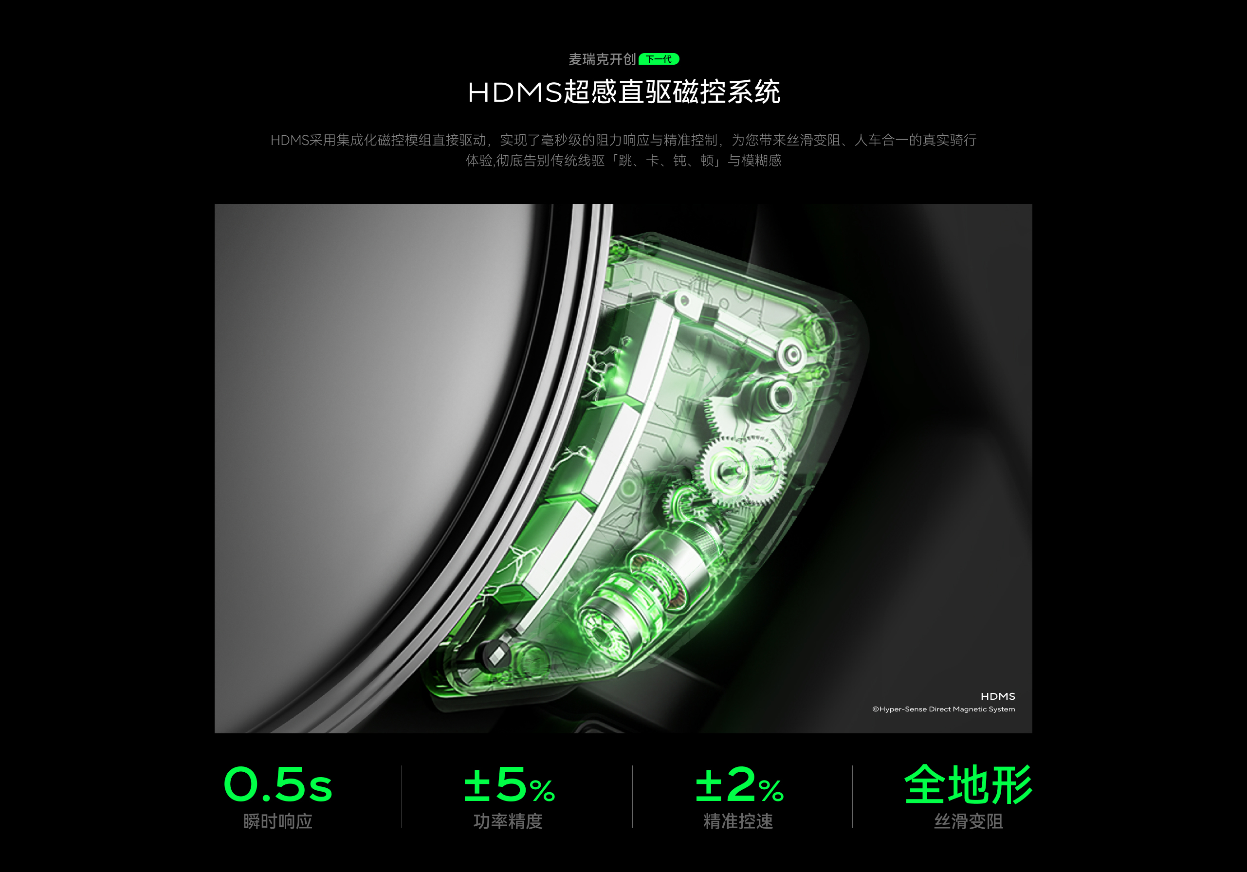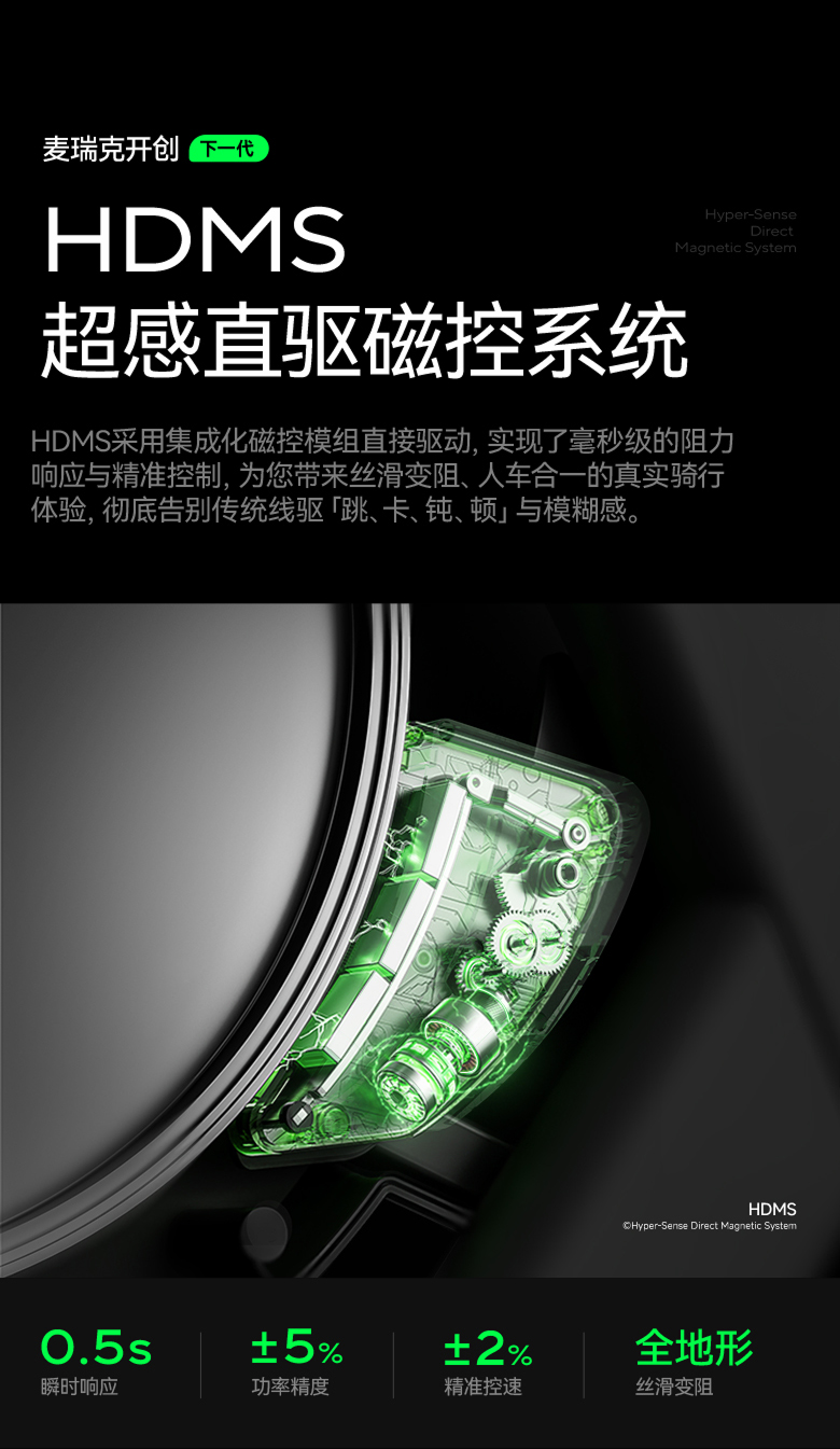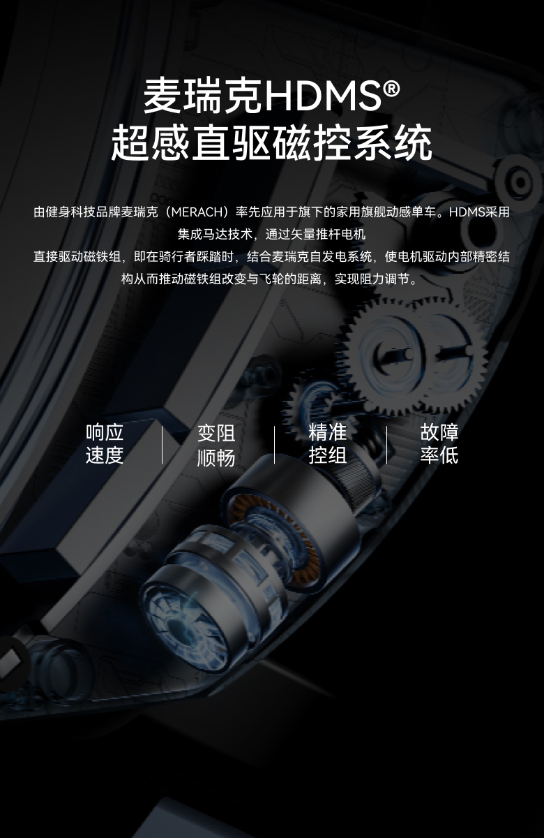 由健身科技品牌麦瑞克(MERACH)率先应用于旗下的家用旗舰动感单车。HDMS采用集成马达技术,通过矢量推杆电机